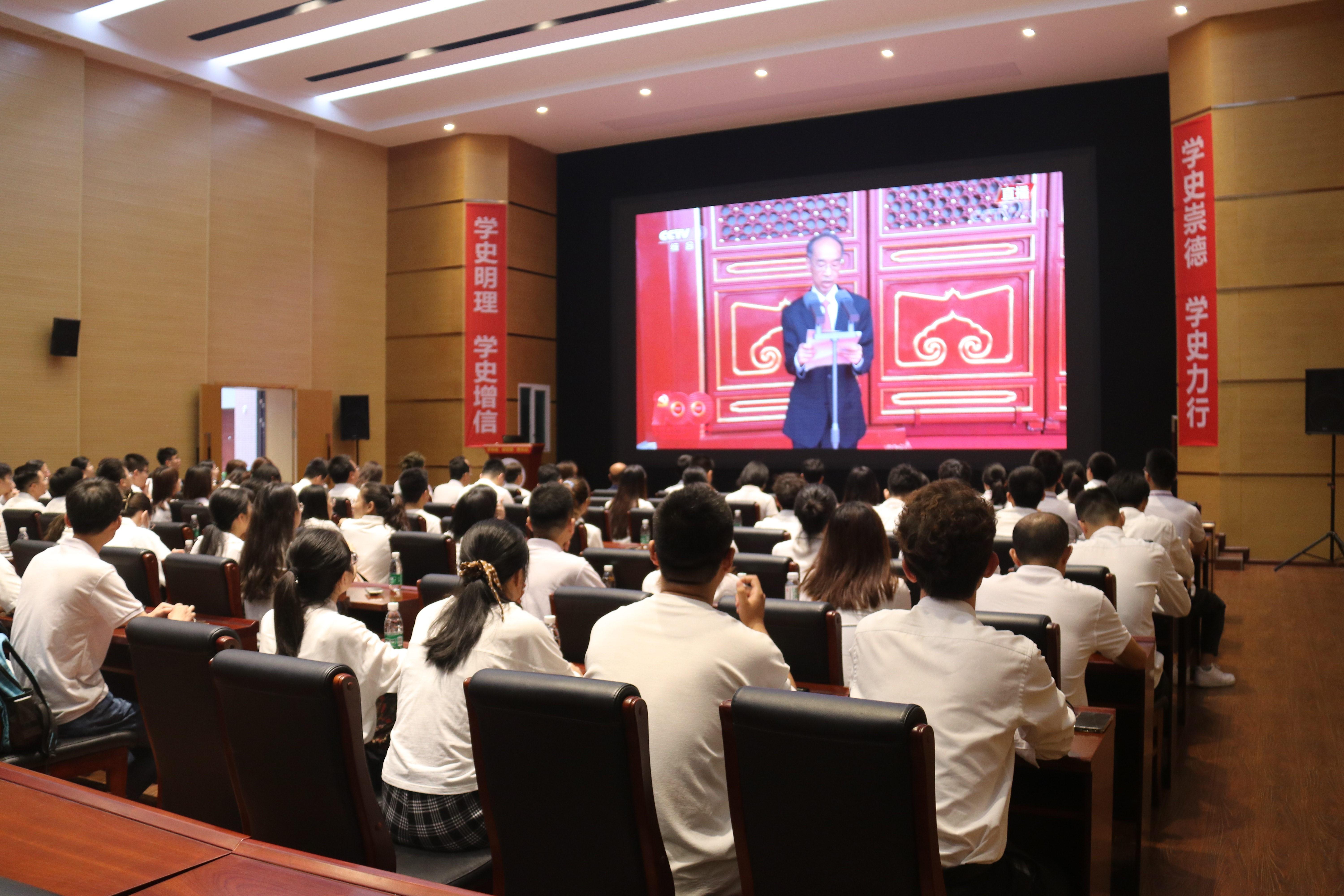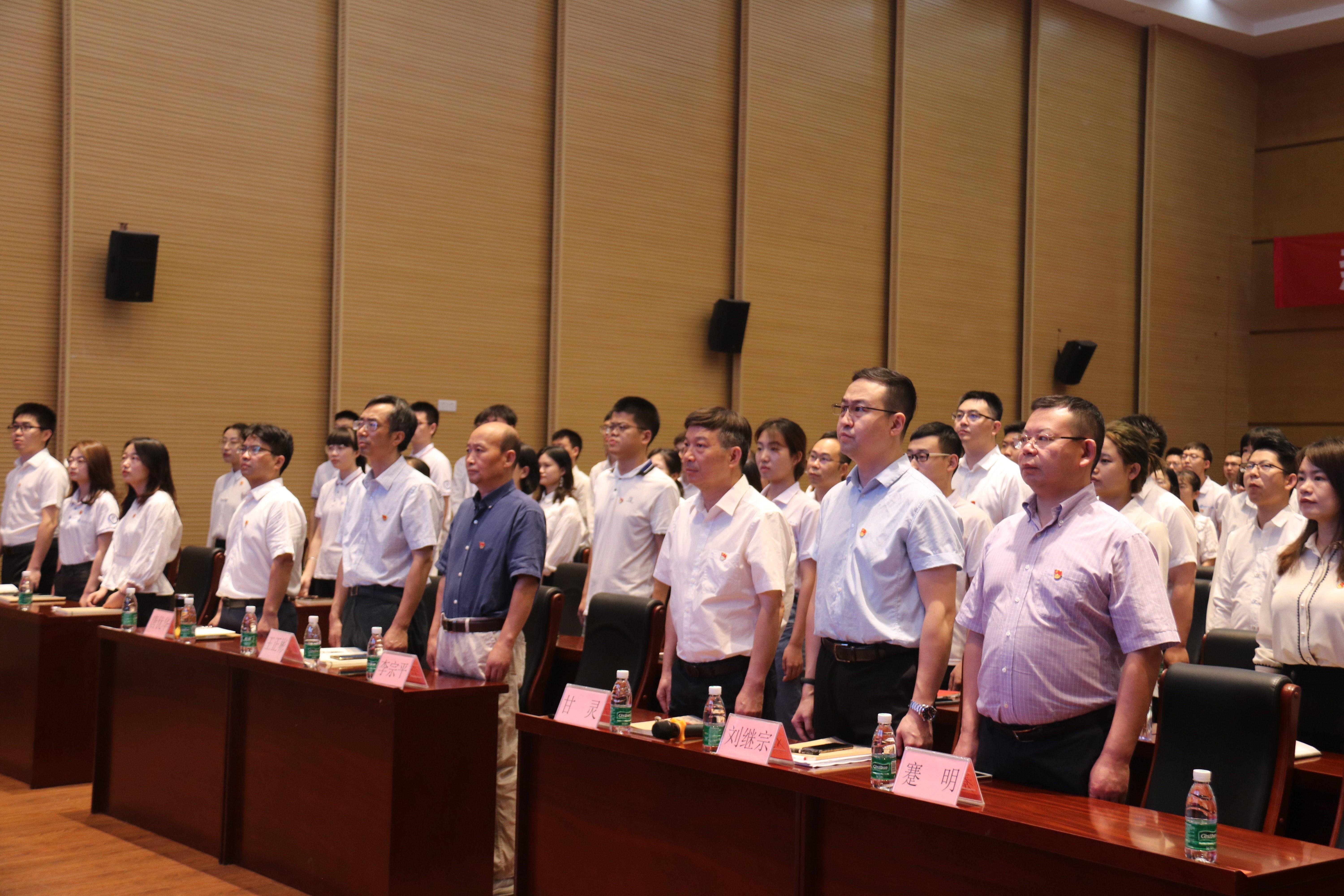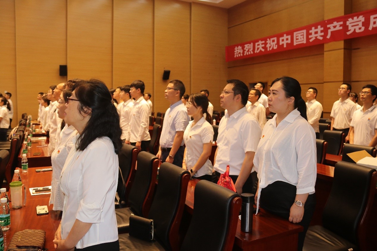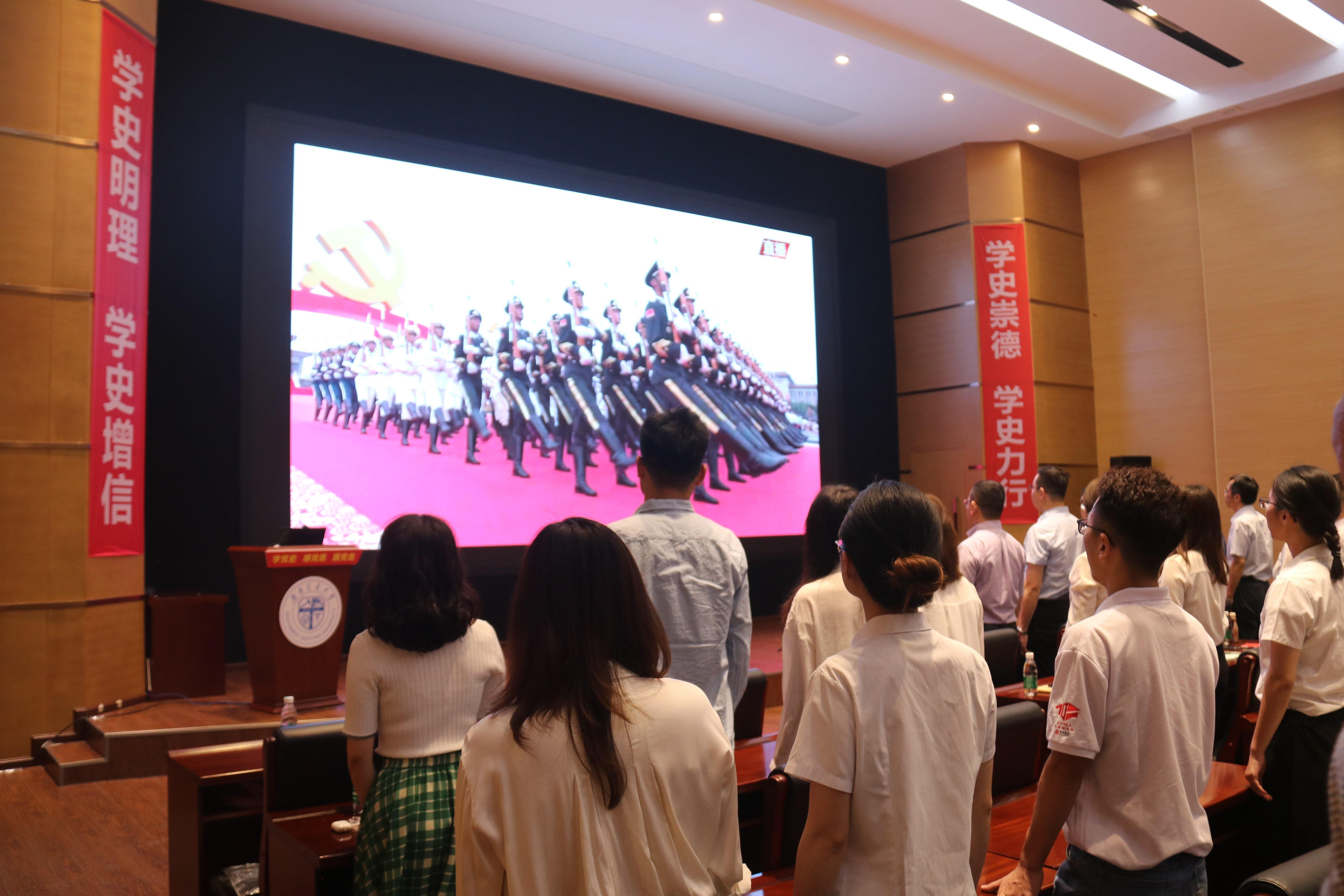 公司师生整齐严肃在报告厅内就坐,胸前党徽熠熠生辉。全体师生肃立迎接五星红旗,在雄壮激昂的《义勇军进行曲》中共同唱出对伟大的中国共产党、伟大的中华民族的热爱之情。