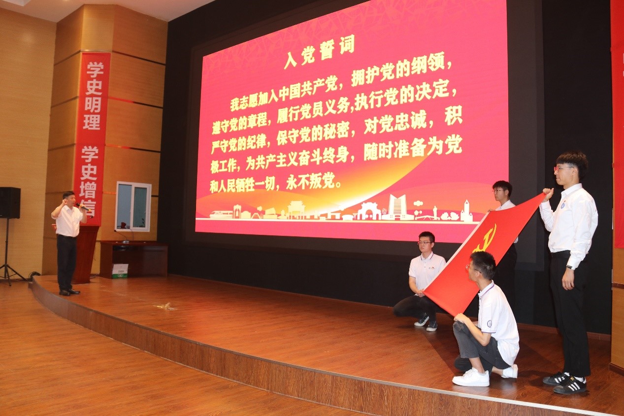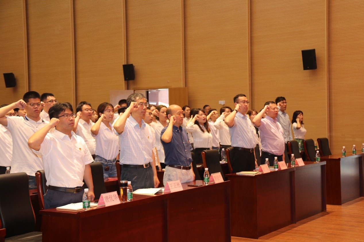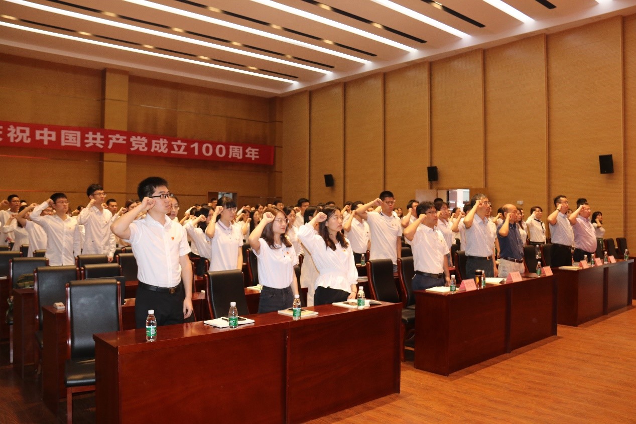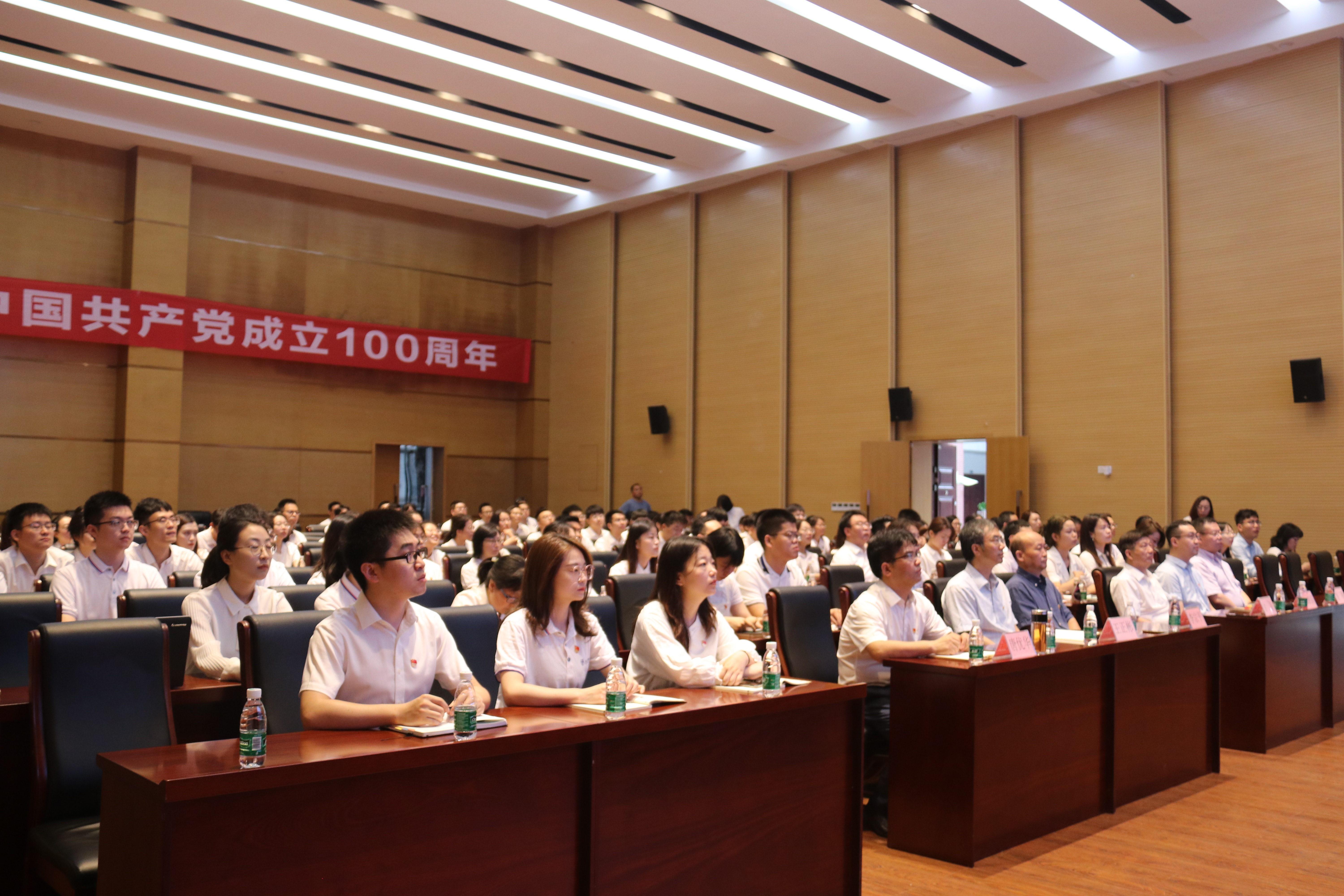 公司师生整齐严肃在报告厅内就坐,胸前党徽熠熠生辉。全体师生肃立迎接五星红旗,在雄壮激昂的《义勇军进行曲》中共同唱出对伟大的中国共产党、伟大的中华民族的热爱之情。