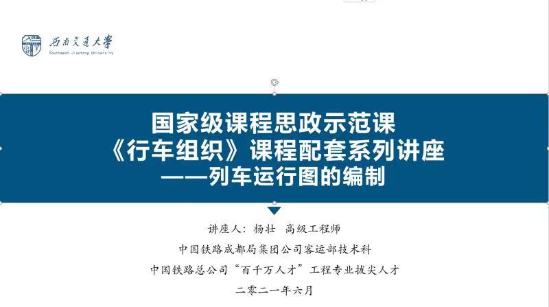 “课外导师进学堂”系列讲座是《行车组织》课程配套内容之一,除了讲解列车运行图的编制,后续还将结合课程的学习进度邀请现场工作人员、行业专家等为同学们带来多场线上、线下讲座。《行车组织》课程的总体思路、建设目标、教学内容、具体做法、评价体系等体现了这门课程深厚的交通情怀与丰富的思政内涵。