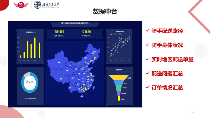 幸“盔”有你队由王坤老师指导本次活动中荣获金奖,该队伍由来自物流工程专业的黄嘉博、张扬、梁睿、丁媛媛、张忠博、张涵六位同学组成,他们成绩优异,竞赛经历丰富。团队的项目课题是“基于智能头盔的外卖出行解决方案”,以智能头盔为中心、日日顺出行场景为基础,设计了智能外卖头盔并初步完成其概念模型与功能流程的展示。团队通过前期充分的市场调研形成了调研报告,分析并找到现有配送方式的痛点,并且针对这些痛点为骑手量身定做了外卖出行场景解决方案。除此之外,团队还设计数据中台与app挖掘数据价值,辅助决策。通过与日日顺场景物流的结合,实现攸关方共创共享。