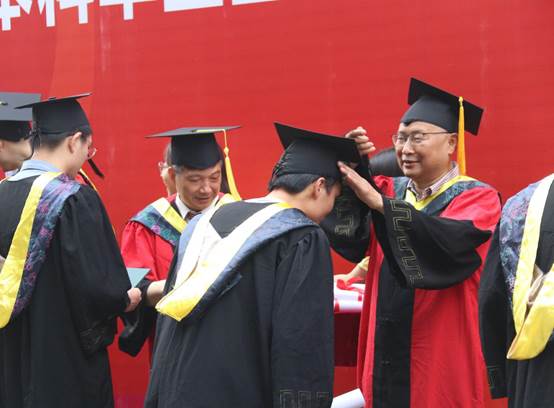 接下来,老师们为2020届本科毕业生们授予学位,各班同学保持安全距离有序入场接受授位。此次参与授位的300余名同学,依次走上前来,向老师们鞠躬,感谢老师们四年以来的辛勤付出和真切爱护。毕业生们还特意准备了花束献给四年以来朝夕相处的老师们。