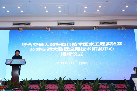 2018年10月12日,beat365体育官网综合交通大数据应用技术国家工程实验室公共交通大数据应用技术研发中心在深圳五洲酒店举行授牌仪式。公司副经理罗霞教授、刘海旭副教授,深圳都市规划设计研究院薛博经理、董威副经理等研发中心团队成员出席本次授牌仪式。出席本次授牌仪式的人员还包括交通运输部运输服务司、南京市交通运输局、中国城市规划设计研究院、贵阳公交集团、贵州凯里公共交通总公司、宁波市规划设计院、美国交通与发展政策研究所等单位的相关领导和专家。此外,受公司领导委托,公司对外合作与联络处员工工作办公室阮波主任也专程前往见证此次授牌仪式。