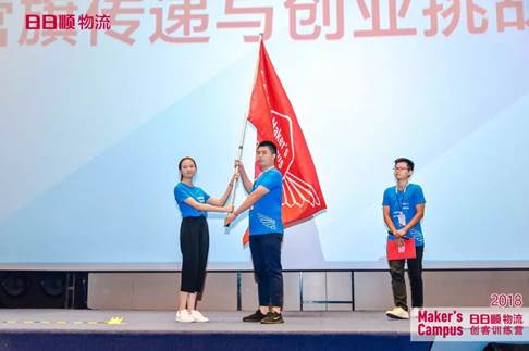 接着由公司曾永家右学姐作为上届代表上台致辞,进行营旗传递以实并向2018届创客下挑战书。