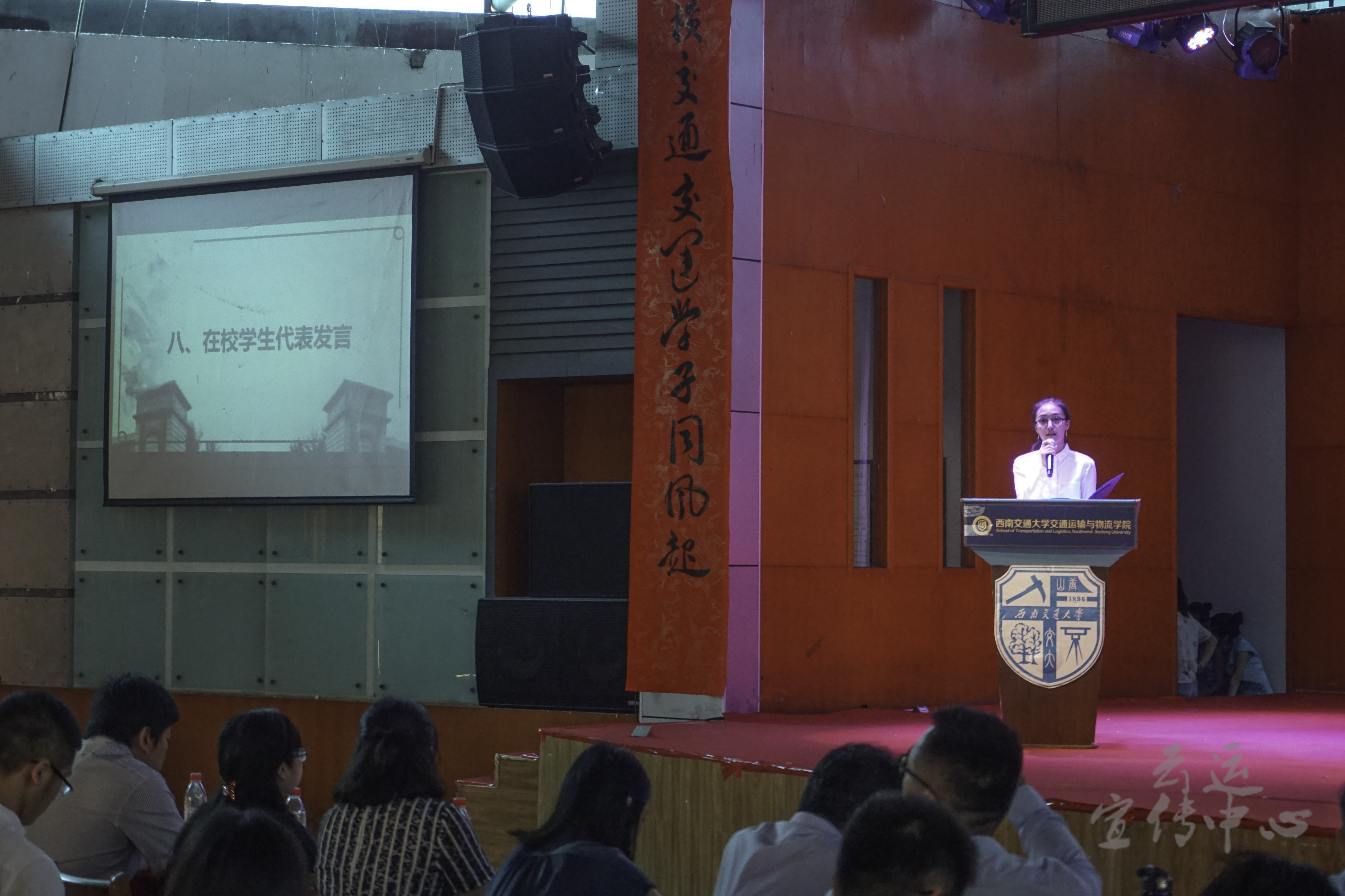 2015级硕士毕业生代表吴灏、褚健圣同学和2014级本科毕业生代表何曦、黄江彦同学上台发言。发言中,他们感叹校园时光的流逝之快,几年的学习经历,使他们受益颇丰。他们感激母校、母院以特色的优势学科为他们搭建了梦想桥梁,举办的学术讲座和员工访谈也在不断地激励他们。随后,他们对恩师表达了感谢,并承诺传承交大竢实扬华精神,不忘初心,振翅翱翔。最后,他们代表全体毕业生表达了对公司未来发展的祝愿,以及对各位老师、同学的祝福。随后,2017级交运詹班李梦瑾同学代表在校员工发言,李梦瑾同学先对学长学姐们给予的帮助表达了感谢,并表示各位在校生同学将继续传承并发扬交大精神,最后她表达了对即将毕业的学长学姐们衷心的祝愿。