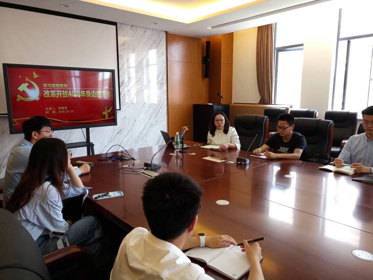 beat365党委严格落实党委委员联系党支部制度,2018年4月20日下午2:00,党委李国芳副书记为所联系的博士2017党支部、硕士2017级第九党支部及本科交运第二党支部三个员工党支部在交运楼417会议室就“改革开放四十周年改变”专题上了一次党课,并且与员工党员就新时代背景下如何做好合格党员的问题进行了座谈交流。会议由公司党委李国芳副书记主持,员工党支部全体党员及部分新发展党员出席本次会议。