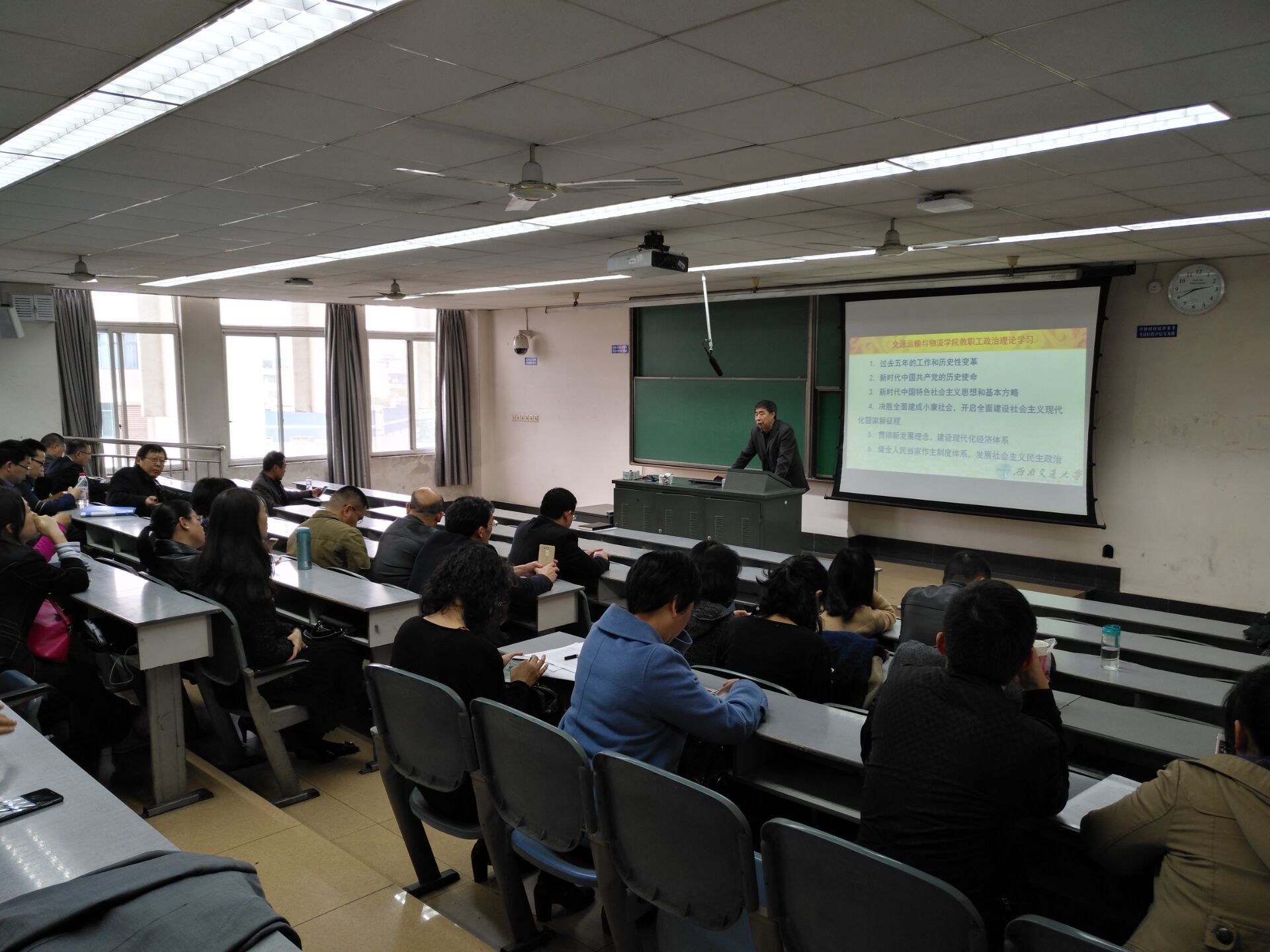 最后,郝书记强调:一、各系(部门)要严格按照教职工政治理论学习计划,保质保量完成政治理论学习,不得以业务学习代替政治学习,学习一次上报一次学习简报;二、全院教职工要深入学习领会党的十九大精神实质和核心要求,用习近平新时代中国特色社会主义思想武装头脑,始终用科学理论,强基固本,争当学习宣传贯彻党的十九大精神的楷模和表率;三、要认认真真、原原本本地学习党的十九大报告和党章修正案,着力在掌握精神实质上下功夫、在学深学透上下功夫、在融会贯通上下功夫,完整准确地领会党的十九大提出的新思想、新论断、新要求,用党的十九大精神武装头脑、指导实践,推动公司各项事业改革发展,为“复兴交大、建设轨道交通领域世界第一的beat365体育官网”做出新的贡献。