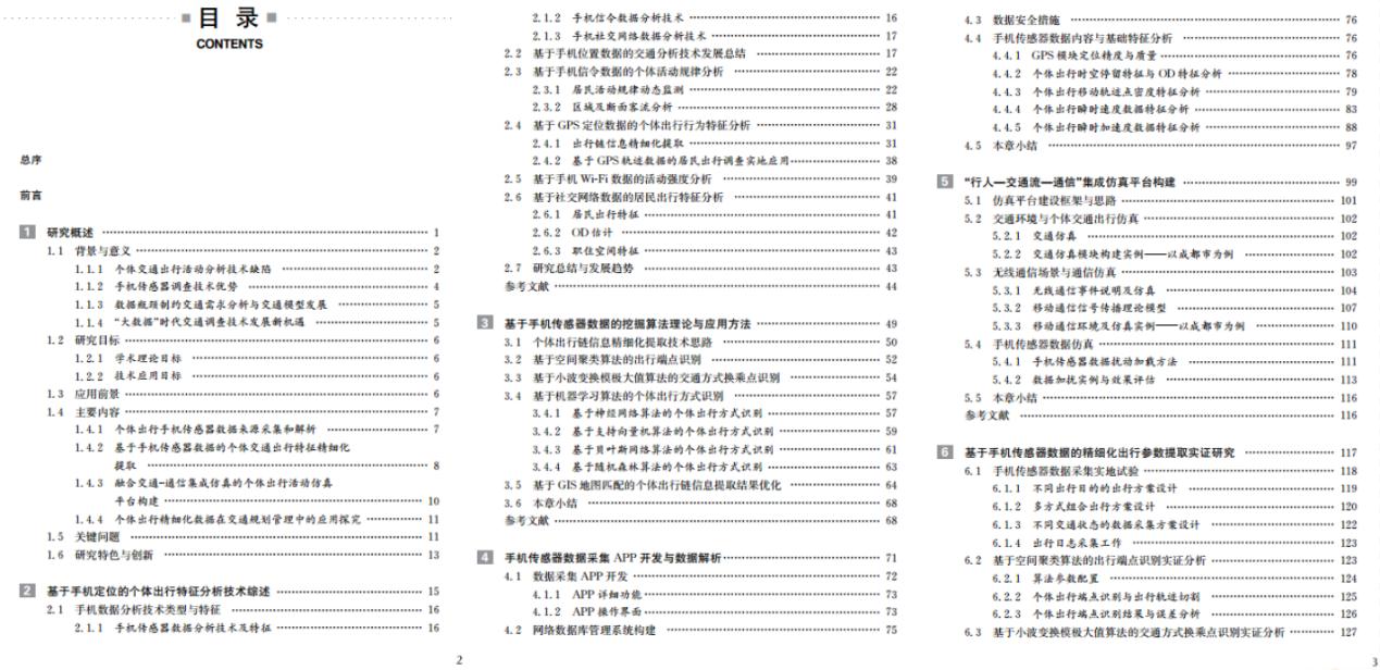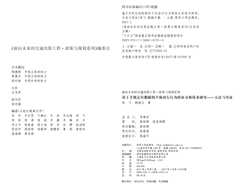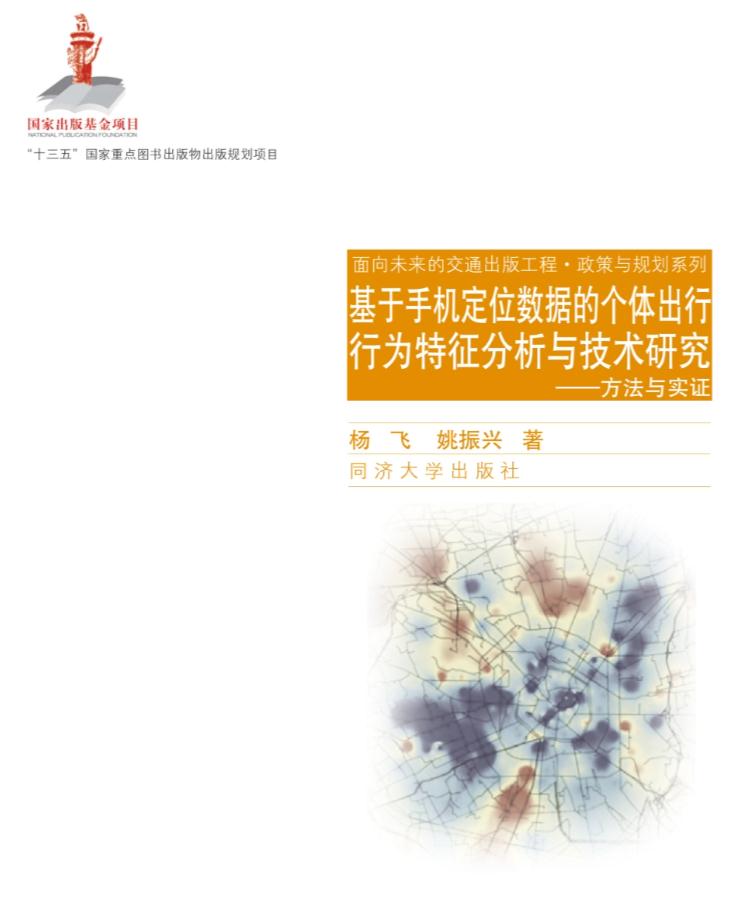本次出版专著成果主要依托杨飞教授主持的2项国家自然科学基金面上项目开展研究,即“基于手机APP传感器数据的个体出行特征精细化提取与交通模型优化(项目编号:51678505)”、“融合多源移动定位时空数据的居民出行调查与活动行为分析技术研究(项目编号:51178403)”,主持的教育部新世纪优秀人才支持计划项目“基于新一代移动通信事件和定位技术的城市交通管理决策支持研究(项目编号:NCET-13-0977)”、beat365体育官网高层次人才计划项目“竢实之星”以及系列结合政府管理部门和交通行业发展实践需求的工程横向应用实践科研课题进行研究成果凝练,充分重视理论与实践的融合,有助于为科研学术成果向交通行业实践应用转化做好准备。