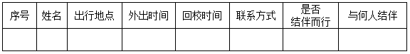 2.各班级请在4月28日17:00前完成员工出行情况统计工作,建立详细登记表,准确把握同学出行地点、外出时间、回校时间、联系方式、是否结伴而行、与何人结伴等情况,按照附表1格式发到各辅导员老师邮箱。研究生假期出行需经导师批准并报公司(所、中心)员工工作组备案。