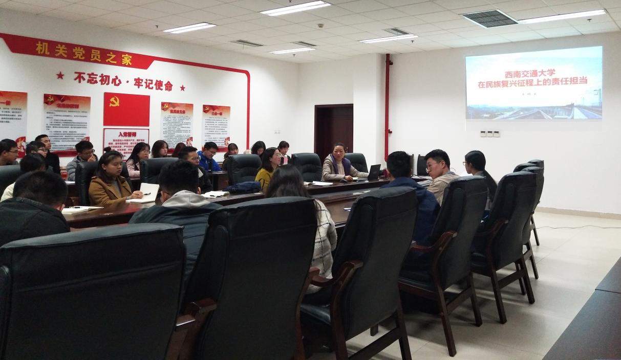 2019年11月21日下午4时,本科交运第三党支部联合本科汉语支部、交运硕士19第三党支部、交运硕士19第五党支部邀请到校机关党委副书记、纪委书记陈璐同志在综合楼104会议室为同志们讲党课,此次党课以《王顺洪为全体中层干部讲授党课:在交通强国征程上西南交大的责任担当》为学习内容,传达王顺洪同志专题党课精神,宣传交大人先进事迹,强化党员的使命担当。本科交运第三党支部全体党员参与会议。