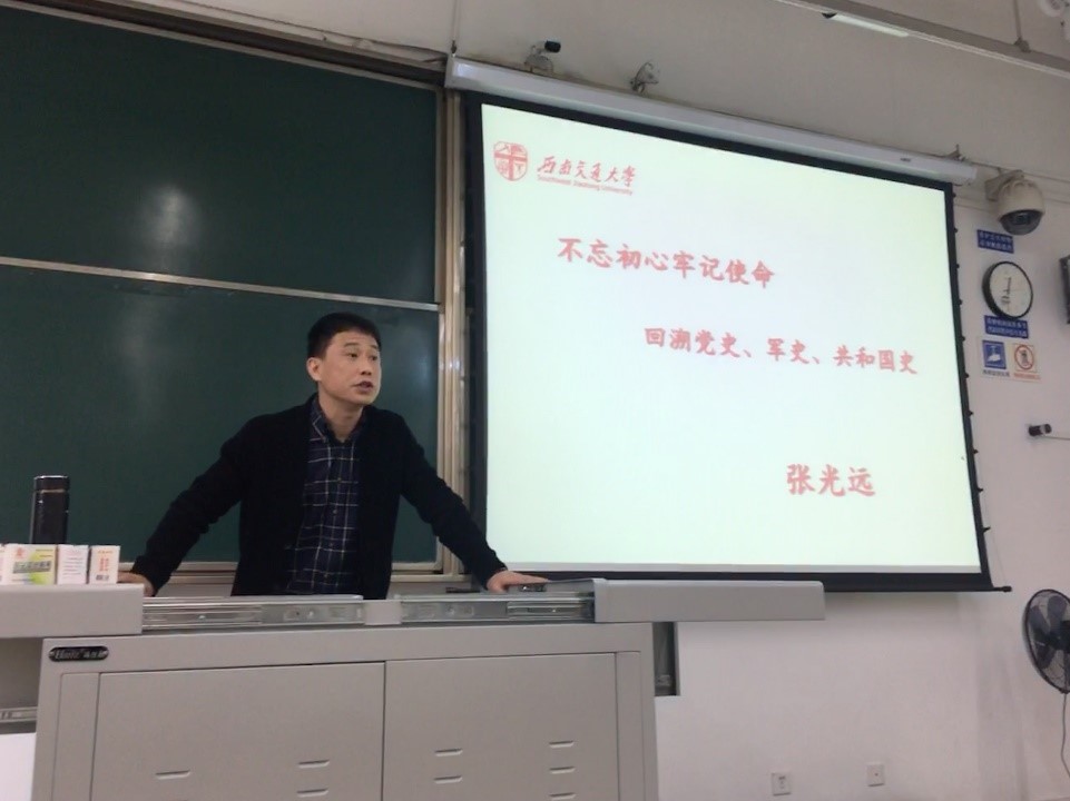 为扎实推进“不忘初心、牢记使命”主题教育,beat365党委张光远副经理2019年10月24日下午3:00在犀浦校区X2221为本科交运第二党支部、博士15级党支部、硕士19级第三党支部和硕士19级第八党支部全体党员讲授“回溯党史军史共和国史”专题党课。