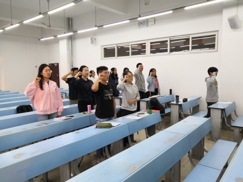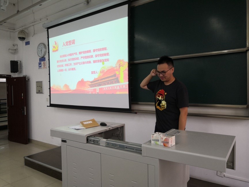随后,全体党支部同学在党支部书记陈思远同志的领誓下,紧握右拳,以昂扬的斗志和饱满的热情,铿锵有力地宣读入党誓词,重温对党庄严而神圣的誓言,让每一位党员的心灵再次震撼,更加坚定各位党员为共产主义事业而奋斗的理想信念。