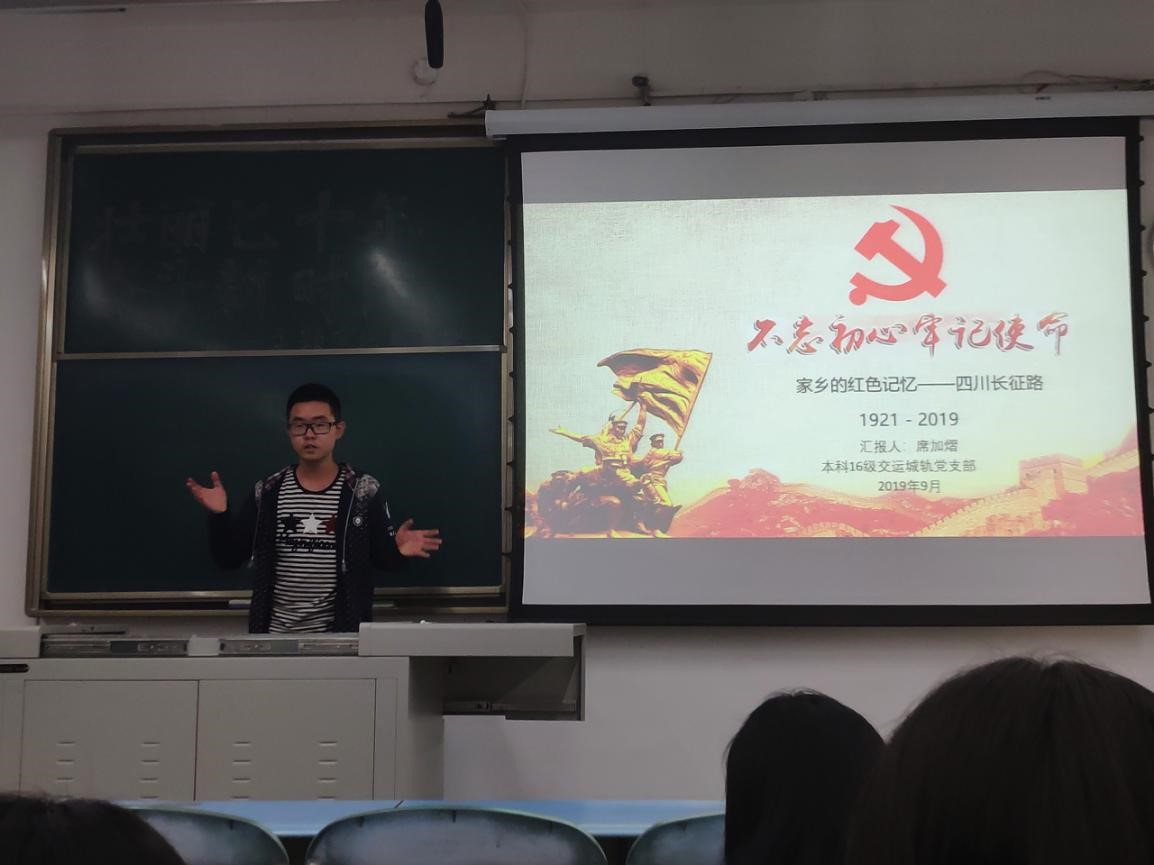 本科2016级城轨党支部代表席加熠同志介绍了四川境内的长征路。他谈到,长征精神永不过时,它是中华民族精神最高的浓缩和提炼,我们要大力弘扬伟大长征精神,在新的长征路上继续奋勇前进。本科物流第一党支部陈锐同志,展示了东坡故里、天府眉山的发展成就。一代代东坡人的努力奋斗,践行着共产党人的初心和使命。本科物流第二党支部党沛宁同志从饮食结构显著改善、衣着消费日趋高档、居住环境明显改观、交通通信更加便利、医疗卫生体系不断完善、教育成果惠及全民几个方面阐释了她的家乡内蒙古人民的生活水平有了明显提升。七十载栉风沐雨,七十载砥砺向前,草原人正向无限风光而去。