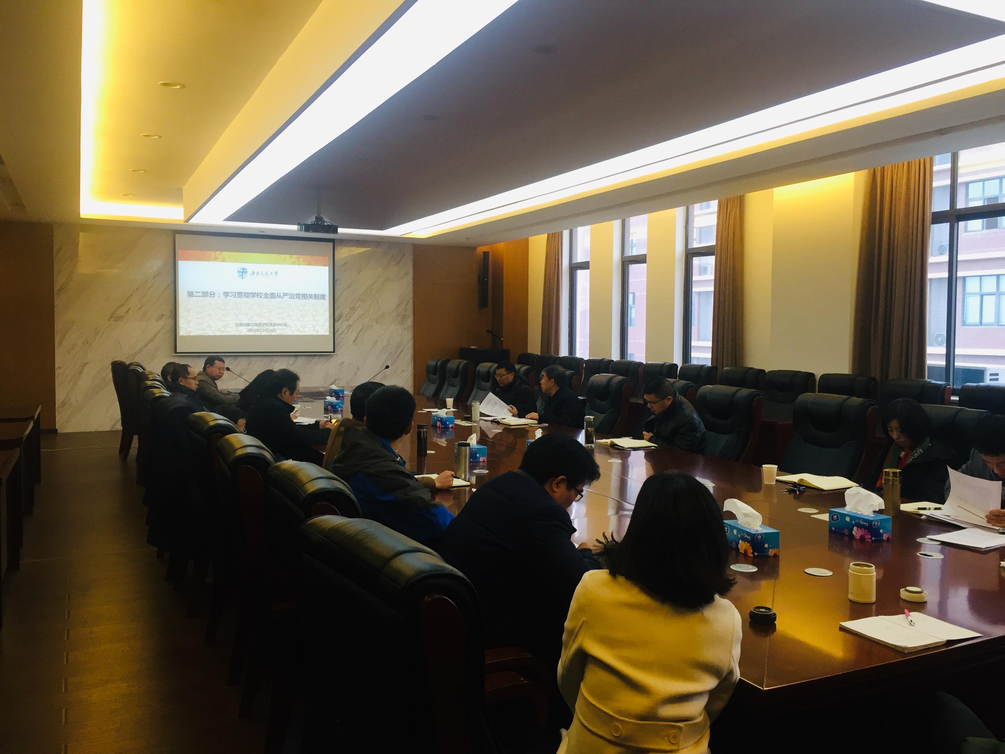 纪委书记李国芳同志首先介绍了公司纪委牵头的有关全面从严治党工作的制度建设情况,校纪委和纪委办(监察处)积极协助公司党委做好管党治党顶层设计,组织专门工作力量,围绕党章、“两个准则”、“四个条例”、“一个规则”等全面从严治党核心党内法规在公司的落地生根,在对公司相关文件制度进行全面梳理的基础上,拟定了2018年“7+7”制度建设规划,已全部完成制定(修订)并发布,初步构建起与新的形势任务要求相匹配、相适应的全面从严治党制度体系。