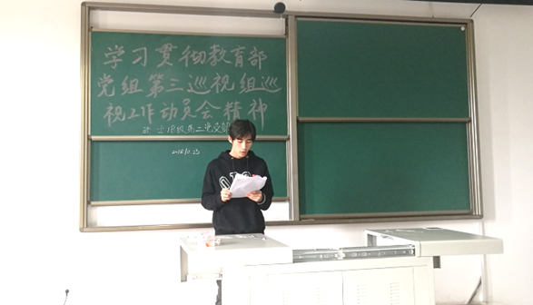 2018年10月10日,教育部党组第三巡视组巡视beat365体育官网党委工作动员会在九里校区国际会议厅召开。会上,教育部党组第三巡视组组长陈德文就即将开展的巡视工作作动员讲话,公司党委书记王顺洪同志代表公司党委作表态发言。为深入学习贯彻巡视工作动员会精神,beat365硕士18级第二党支部于10月23日在9505教室开展了以“学习贯彻教育部党组第三巡视组巡视工作动员会精神”为主题的组织生活会。
