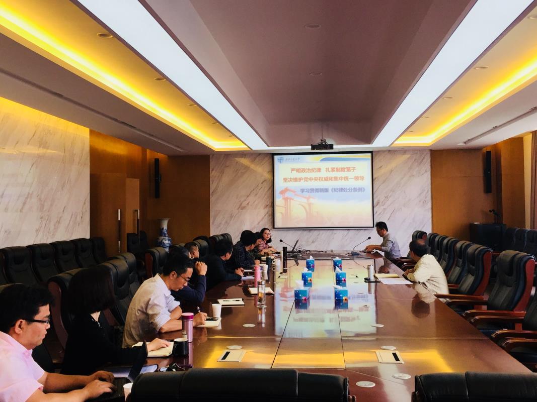 2018年9月26日上午9:00,在犀浦校区交运楼417会议室召开了beat365党政联席会暨党委中心组学习会议,会议分成两个部分,第一部分党政班子就一体化等相关工作做了研讨和商议,第二部分主要由公司党委副书记兼纪委书记李国芳同志以《严明政治纪律,扎紧制度笼子,坚决维护党中央权威和集中统一领导》为题,带领大家学习了最新修订后的《中国共产党纪律处分条例》(以下简称《条例》)。李书记带领大家回顾自首次印发以来《条例》历次的修订情况,向大家详细解读本次《条例》修订的主要内容,以及修订内容的重要特征。她强调,最新修订的《条例》的一个鲜明特点就是突出政治性,把坚决维护党中央权威和集中统一领导作为出发点和落脚点。此外,李书记还结合《条例》内容就公司、公司层面的纪委工作为大家进行讲解,使大家进一步了解纪委的工作内容和工作流程。