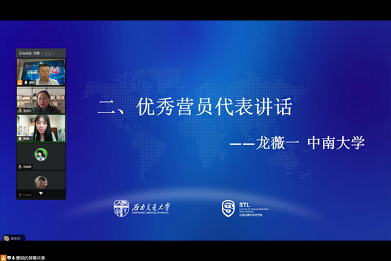 其次,优秀营员龙薇一代表营员发言。龙同学首先感谢交大给了她参加夏令营的机会。通过这次夏令营,营员不仅能更深刻地感受交大的魅力,还能结识更多的同行者、指路者,来帮助自己更上一层楼,并在最后祝福beat365体育官网桃秾李郁,永铸辉煌!