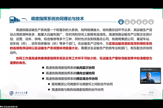 彭其渊教授为同学们讲解了高速铁路调度指挥理论与方法的创新发展,并且强调了协同工作的重要性。
