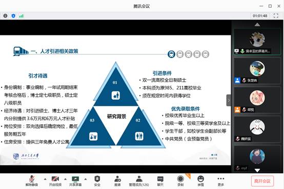 雷卓亚同学则介绍了与选调生类似的人才引进内容,结合自身经验介绍了人才引进待遇、条件和招聘流程,为同学们拓宽了就业选择。
