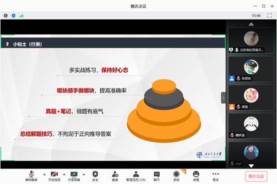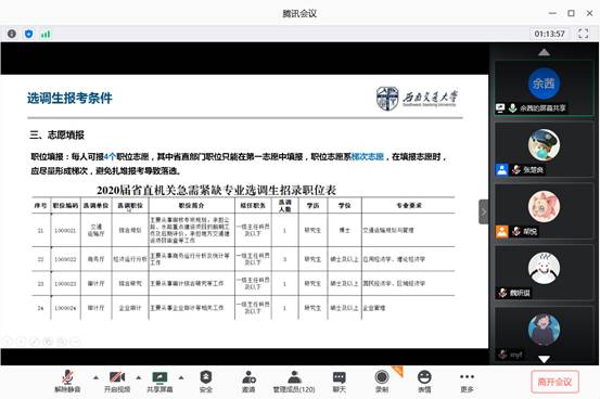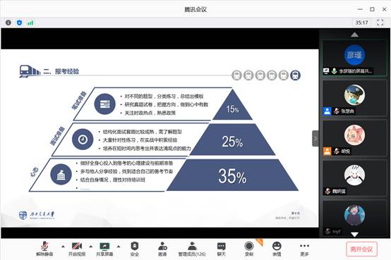 参加工作较久的王立学长就工作地点的选择、工作资薪情况和个人工作经历方面进行了分享。同时针对同学们关心的选调生培养、报考时间节点、工作注意事项等问题进行了答疑,互动气氛非常活跃。