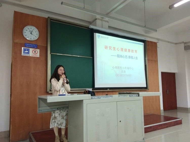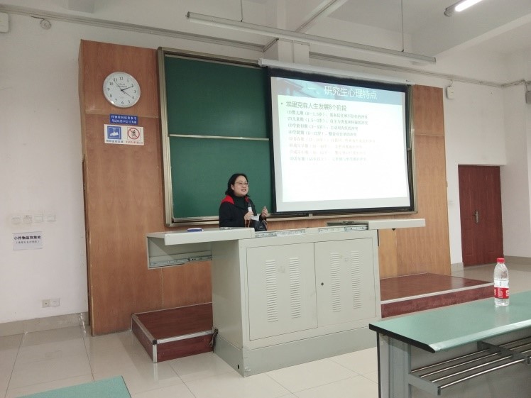 首先,高燕老师以“研究生心理健康教育——阳光心态、幸福人生”为题,从研究生的心理特点、研究生的心理困境、积极应对 健康成长三方面进行讲解。高燕老师指出,研究生正处于个人发展和人生规划的关键时期,面临着生涯规划紧迫、人际关系挑战、学习内容变化、经济压力凸显以及婚恋压力增大五个问题,并对以上问题逐一进行了讲解且提出了应对措施,建议同学们在角色转换的过程中关注自身身心健康,提升社会支持,改变自己固有的认知方式,积极寻求资源。