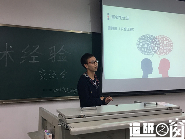 首先,有宁佳师姐分享撰写论文方面的经验。宁佳师姐向同学们介绍了研究生发表论文的各个等级,积极在奖学金方面的加分情况。此外,宁佳师姐还告诫我们研究生论文的写作一定要脚踏实地,有了想法就要尝试着构思撰写,通过不断地积累才能写出高水平论文。在读博方面,宁佳师姐大家要综合自身条件考虑,一旦决定要读博深造,就要坚定信念,潜心科研。随后,左科师兄针对研究生就业为大家分享自己的见解,分析了铁路局、地铁、设计院等单位的情况,并结合自己认识的已经就业的学长学姐的现状为我们分析了之后的就业前景。最后,雷毅成师兄给我们分享了研究生生活方面的经验,他任务研究生应该把学习科研放在首位,但是也要丰富研究生生活,比如参加社团活动,进行体育锻炼。