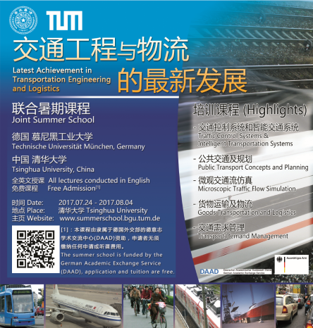 今年,清华大学交通研究所拟于7月24日-8月4日举办第十一期“清华大学-慕尼黑工大暑期公司”,主题为“交通工程与物流的最新发展”。教授阵容由清华大学交通研究所陆化普教授和慕尼黑工业大学布什教授领衔组成,教学内容涵盖交通规划与控制、智能交通系统和货物运输及物流等领域前沿知识。