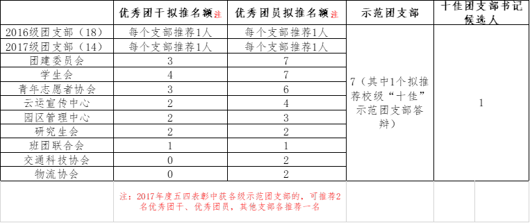 1.优秀个人采取差额评选方式,根据拟推荐名额分配表,以团支部、团学组织为单位进行民主评选。要求推选人员参评年度各类课程无正考不及格,且2017-2018学年综合测评成绩符合相应成绩排名范围的要求,请各推荐单位认真审核拟推荐人员评选资格。如推荐人员经公司审核不满足条件、为无效推荐,将考虑相关推荐单位下一年度对应减少推荐名额。