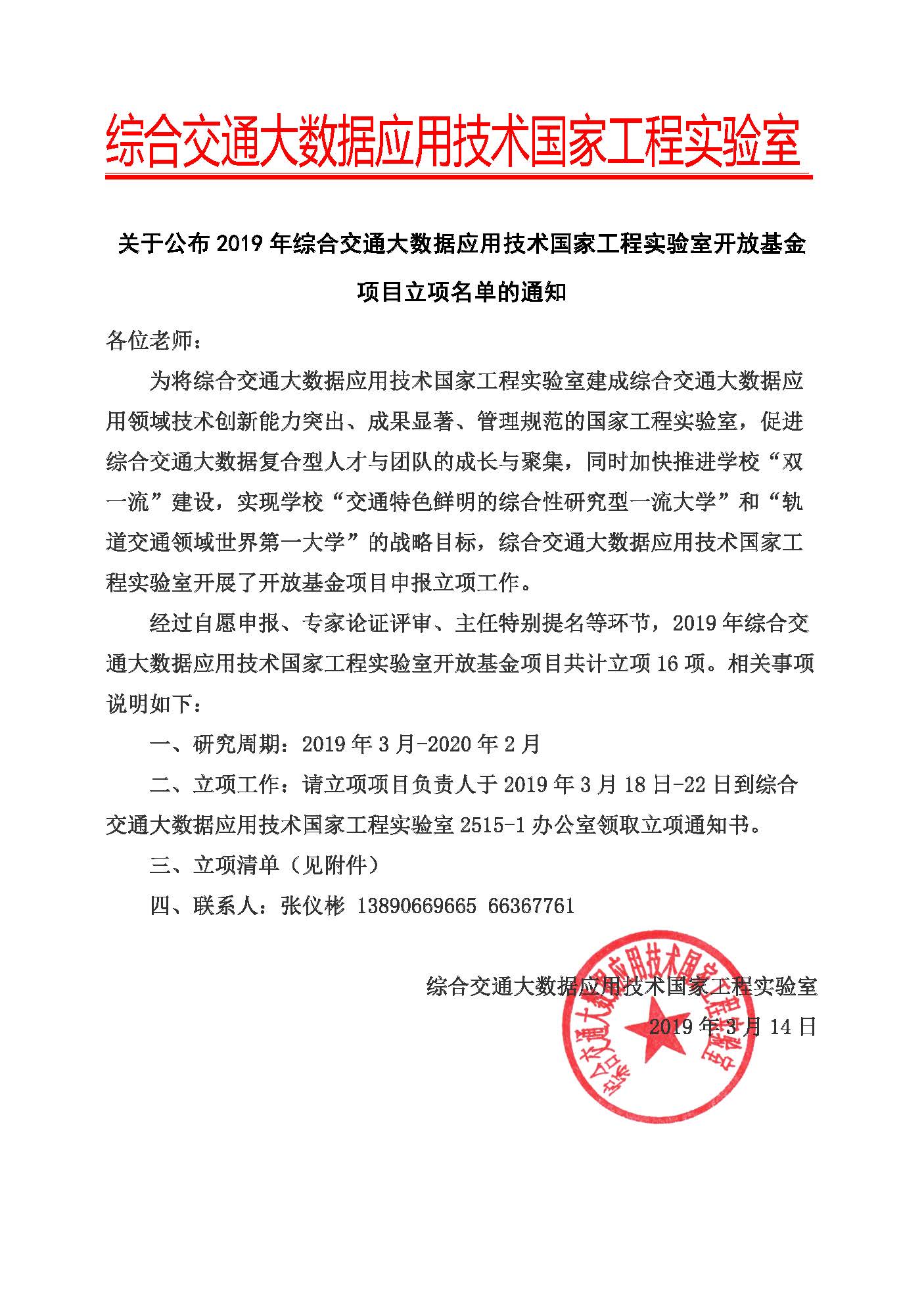 关于公布2019年综合交通大数据应用技术国家工程实验室开放基金项目立项名单的通知
