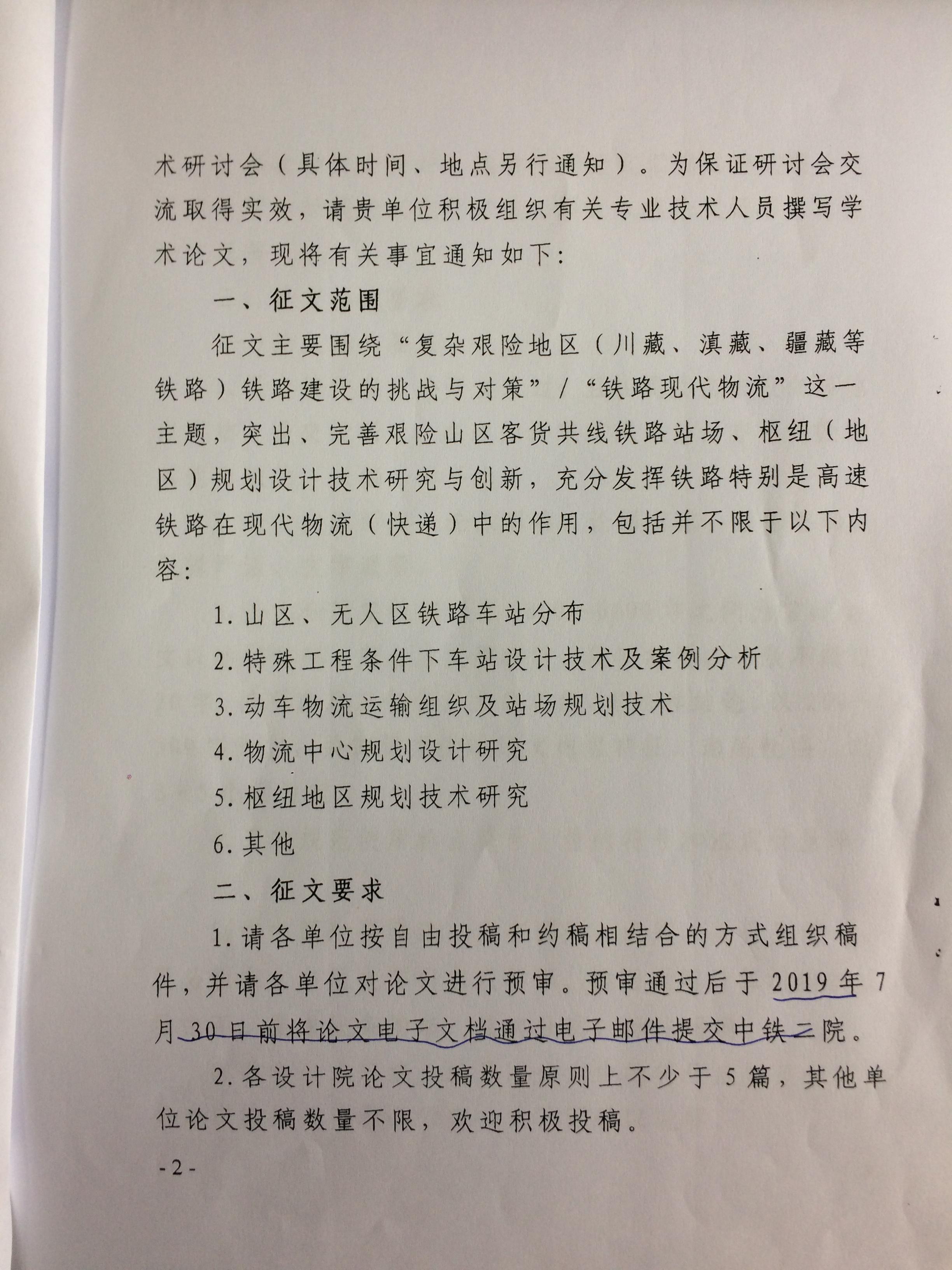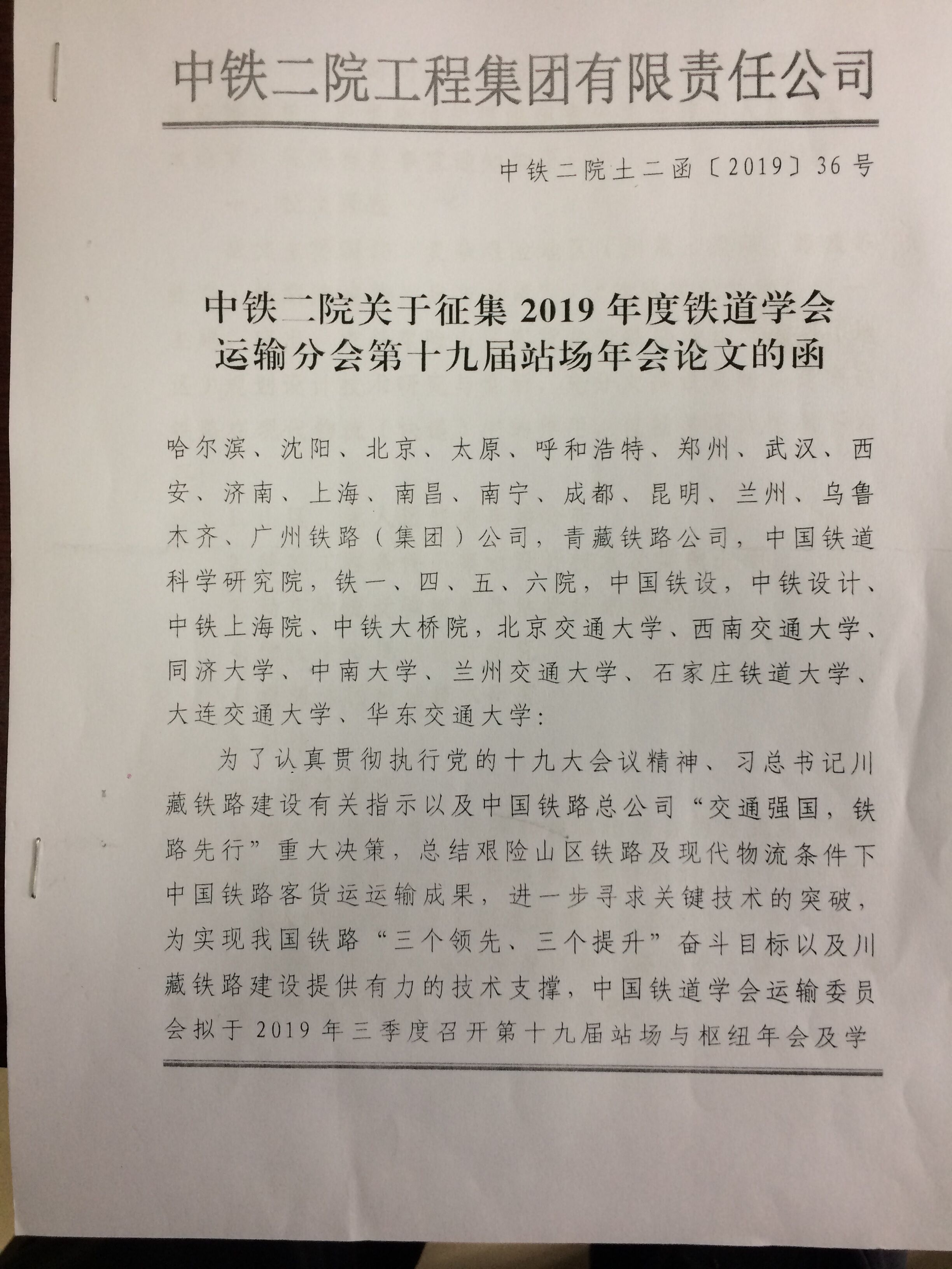 转发《中铁二院关于征集2019年铁道学会运输分会第十九届站场年会论文的函》