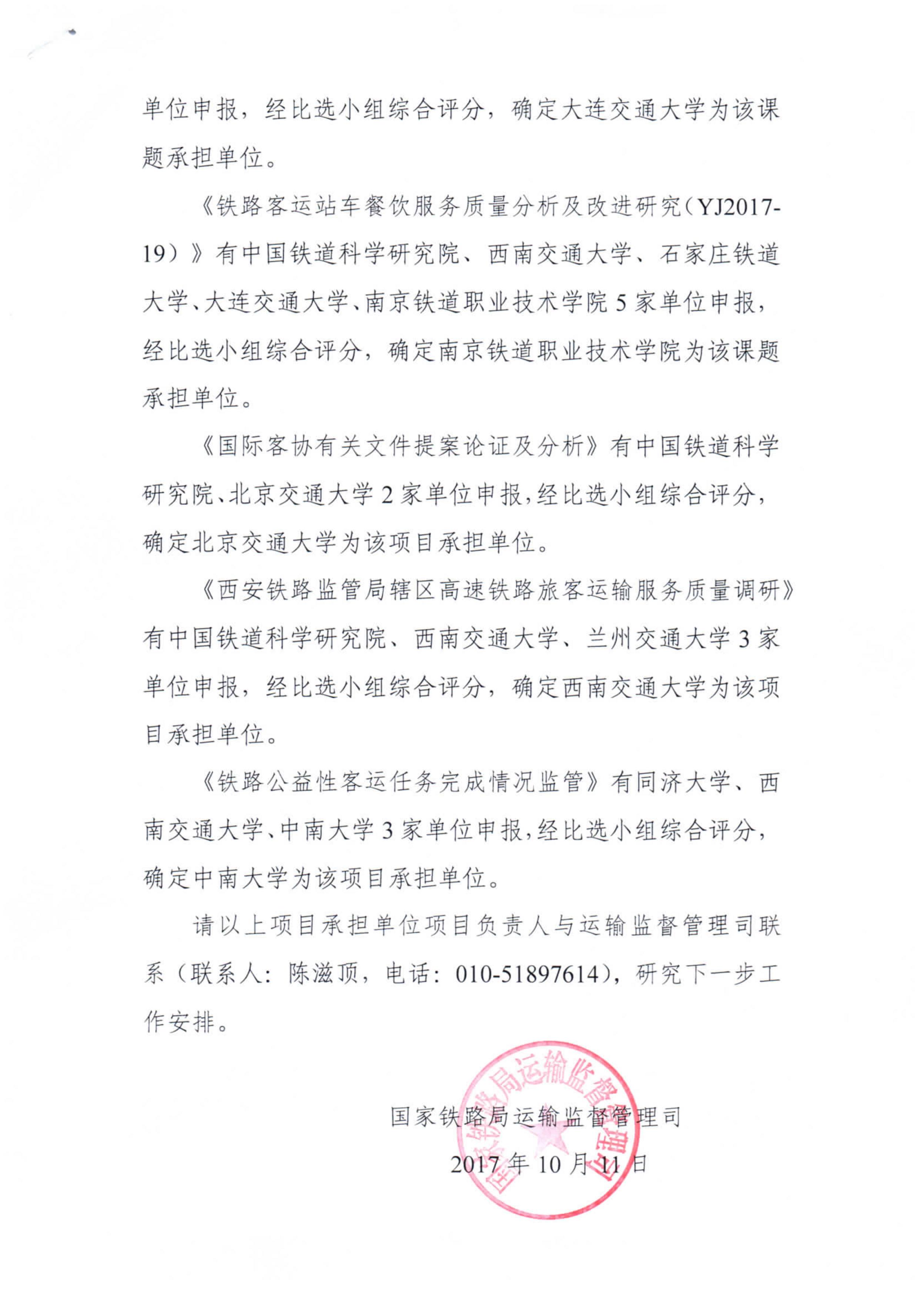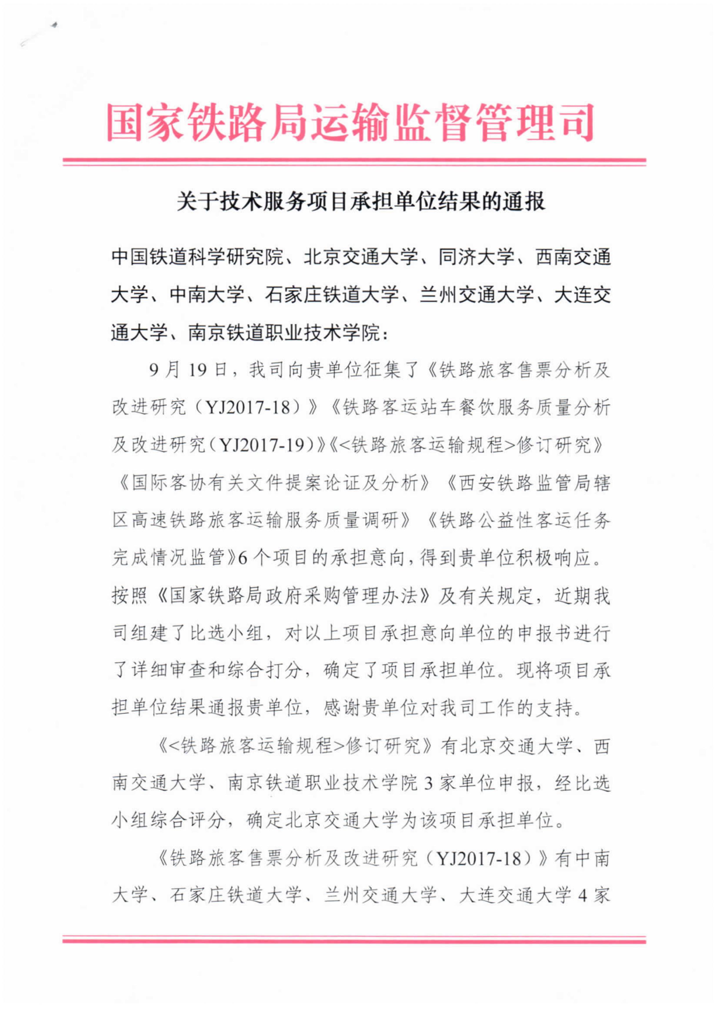 国家铁路局运输监督管理司关于技术服务项目承担单位结果的通报