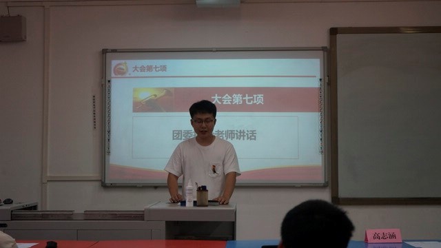 随后,高志涵老师宣读新入团团员名单,随后,团员代表黄晴铮同学为新团员进行了庄重的团徽佩戴仪式。佩戴在团员胸前的团徽,是团员肩负重任的标志,代表团员精神的传递。团徽佩戴完成后,主持人带领大家庄严宣誓。从这一刻起,同学们正式成为中国共青团团员。