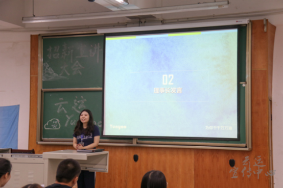 凉风习习,细雨微微。正值秋高气爽之际,大家相聚一堂,先观赏了一段记载云运故事的视频,揭开了云运的神秘面纱。随后,云运理事长张雅睿上台发言,她先对大家的到来表示衷心的感谢,希望更多的人能够加入云运,为建设云运而努力,同时也希望在云运里的时光能够给大家留下深刻的记忆。