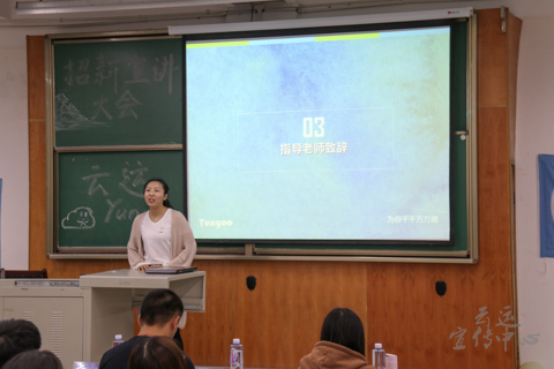 薄琳老师上台讲话,首先对各位新生的到来表示了感谢,她认为正是因为有想要加入云运的大家才创造出今日的云运。最后,薄琳老师希望大家在云运收获技能和友情,更希望同学们能够在云运找到自身的价值。