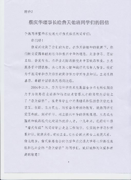 两位重要人物的来信,给与了我们极大的鼓励,让我们能够更加努力的朝着建设更加强大的中国铁路事业而奋斗,与此同时也告诫了我们许多问题。相信在此之后,詹班的同学会继续奋斗,弘扬詹公精神,为伟大的祖国的铁路事业奉献出自己的力量。