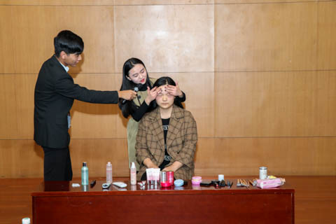 比赛正式开始前,为了使大家对职业彩妆有更好的认识,赖泰羽老师首先为大家介绍了有关化妆的知识,包括化妆的重要作用及其在日常生活中对人的多方面影响。此外,赖老师还请搭档上台配合,现场演示了“快速打造一款基础妆容”步骤,直观清晰地讲解了化妆的基本方法和注意事项。教授过程中,赖老师特别提到,眼妆是整个妆容的“点睛之笔”,画好眼妆不仅能够扬长补短,还能进一步提升自身气质和自信。