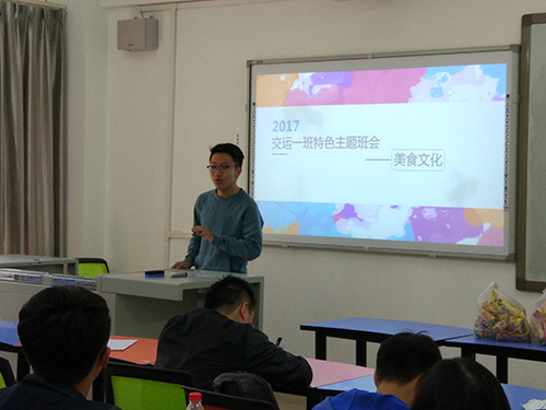 2017年4月13日下午1:00,交运一班在x2109举行“美食文化”特色主题班会活动。班长张友豪简单总结了班级近况后,班会正式开始,各小组代表轮流上台展示,为大家介绍极富特色的地域美食。荣腾凤为大家介绍了耳熟能详的重庆美食;李万恒同学结合个人体验展示了山东美食;王新泽同学则以其幽默的语言分享了南宁美食。最让人印象深刻的是赵华铭同学为大家展示的“川贵陕三省美食新品发布会”,用广告海报的方式生动形象的展现了川贵陕地域美食的特点。此外,还有西安、长沙、南京的美食佳肴。