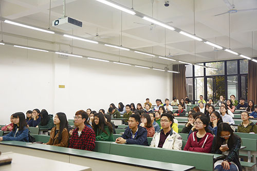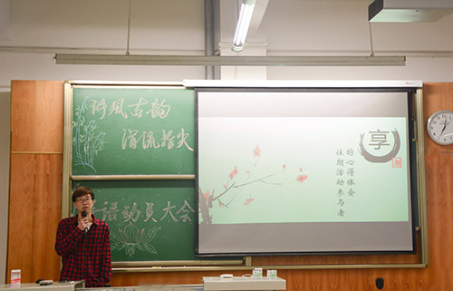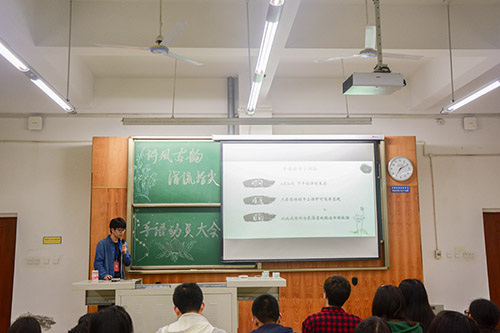 首先,一段手语歌曲《成都》将大家带进手语的世界。主持人张晓光通过PPT向大家展示了历届手语活动中授课、表演,去聋哑公司的照片。接着,由李林卿老师向同学们交流参加活动的感想。手语课堂是一个没有声音的、安静的课堂,手语是一种触动人心的表达。同时,参加活动的过程也让同学们收获了友谊。