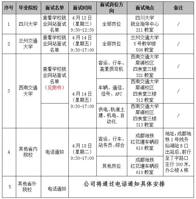 成都地铁运营有限公司2017届本科及以上学历毕业生招聘简历筛选工作已结束,按照招聘流程将进行面试,现将面试有关事项通知如下: